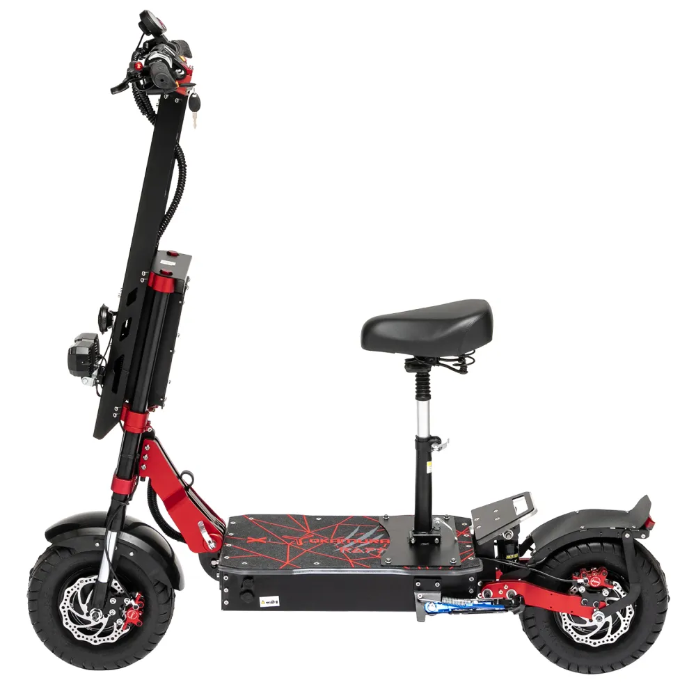 Дизайн выглядит ярким и приметным. Особое внимание стоит уделить объемной, удобное платформе, на которой можно разместить 2 стопы одновременно. Техника рассчитана для езды по асфальту и бездорожью. характеристики допускают маневрирование и преодоление проблематичных дистанций. При необходимости райдер может воспользоваться сиденьем, что стало приятным бонусом для ездоков. Сиденье легко устанавливается на деку самоката и также просто снимается. Модель оснащена двумя мощными мотор-колесами по 2500 Вт, которые могут развить скорость до 80 км/час. Такие характеристики подходят для опытных райдеров и подростков. Надеемся вам понравилась техника. Предлагаем приступить к оформлению заказа. Покупка электросамоката в нашем магазине сделает езду незабываемой. На сегодняшний день модель считается лучшей в своей линейке. Это – масса положительных эмоций, экстрим и выброс адреналина.