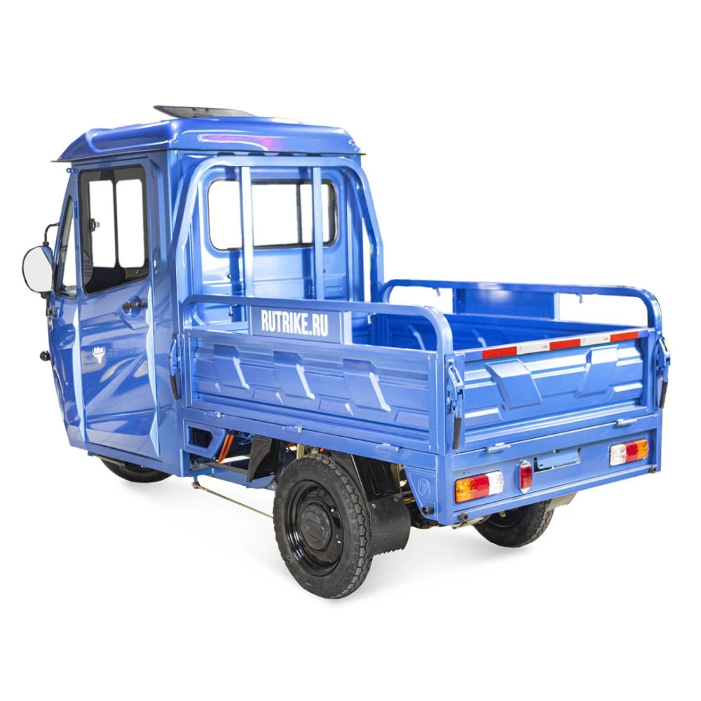 Грузовой электротрицикл Rutrike КАРГО Кабина 1500 60V1000W в темно-синем цвете - это надежное и удобное средство доставки грузов. Он обладает высокой скоростью, большим пробегом и надежным задним тормозом.