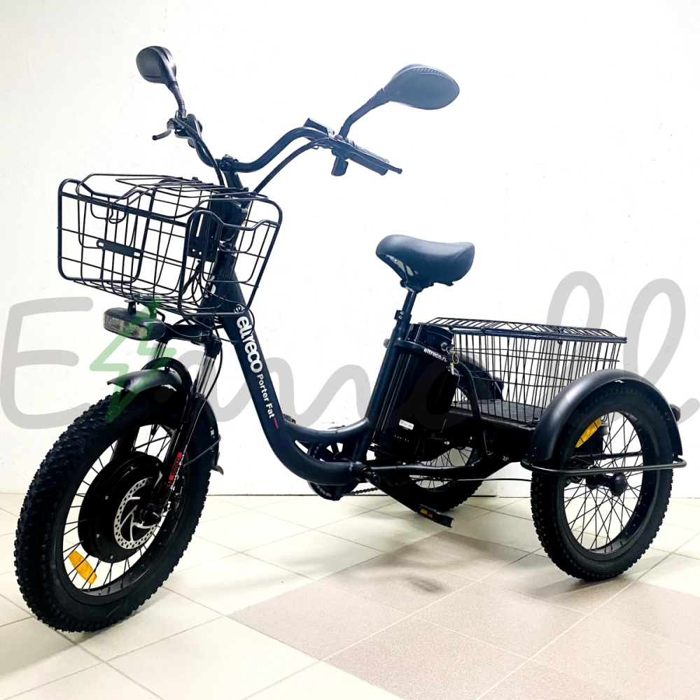 ТРИЦИКЛ ELTRECO PORTER FAT 500 имеет устойчивые колеса диаметром 20 дюймов, достигает скорости в 35 км/час, выдерживает нагрузку в 110 кг.