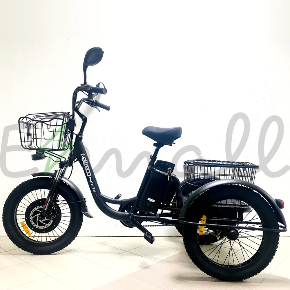 ТРИЦИКЛ ELTRECO PORTER FAT 500 UP! – это современный трехколесный грузовой электротранспорт. Оснащен мощным электродвигателем в 500W, устойчивый и надежный в езде. С ним можно работать на даче, в саду, использовать в поездках по магазинам или для перевозки небольших грузов. Он подходит даже для обычных велопрогулок.