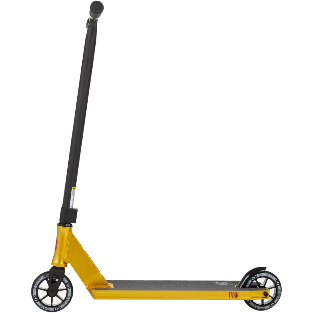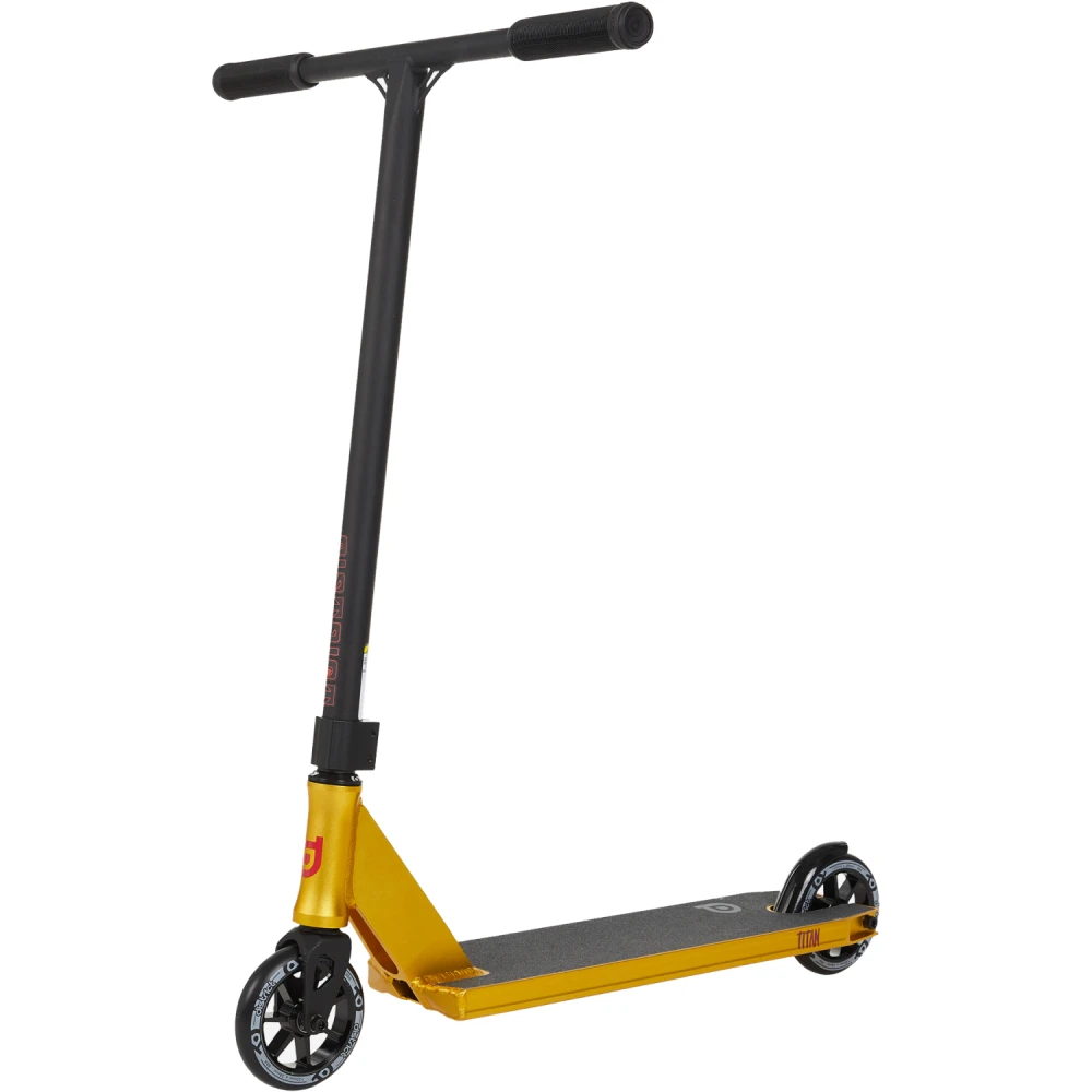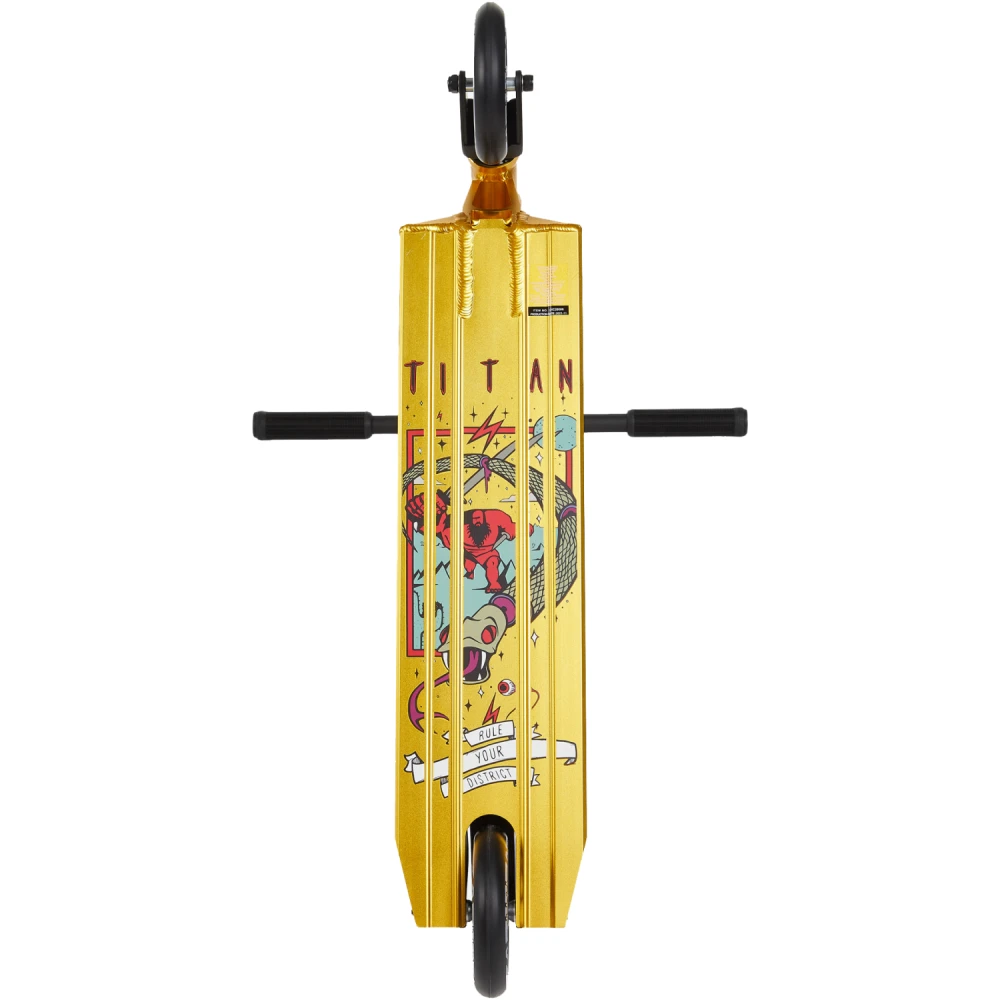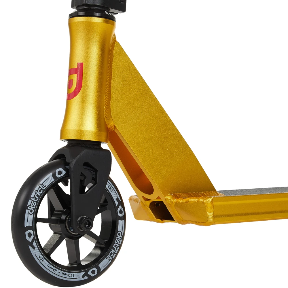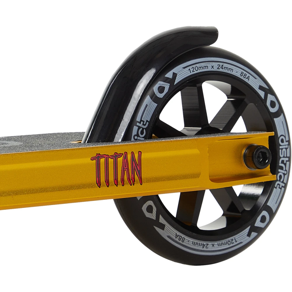 Трюковой самокат District Titan, 120 мм черно-золотой – выглядит круто и современно. Техническая часть – фирменная, совершенствована по максимуму, выдерживает максимальную грузоподъемность до 100 кг при постоянном ежедневном пользовании.